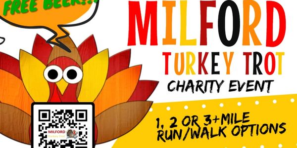 Join us for the www.MilfordTurkeyTrot.com This event has raised over $111k for charity in just the first four years. Joins us for year 5. Live music from the Rum Runners, free beer from NEBCO, Tribus, Two Roads, Viva, Athletic and more. Choose from a beautiful 1/2/3+ mile run/walk route on Thanksgiving morning. Run Now and Gobble Later.